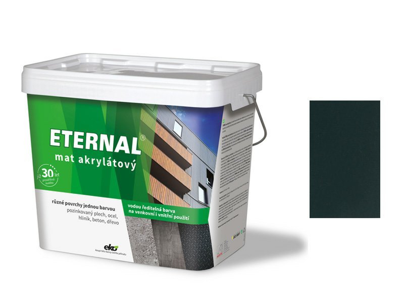 ETERNAL mat akrylátový je hedvábně matná akrylátová vodou ředitelná barva pro venkovní i vnitřní použití. Je určen k novým i udržovacím nátěrům pozinkovaného plechu (i bez předchozí oxidace), oceli opatřené antikorozním základním nátěrem, hliníku (přilnavost nutno předem ověřit). Lze jej použít i k nátěrům nepochozího betonu, mědi, nepochozího dřeva a betonu, neglazované keramiky a dalších stavebních materiálů. Svojí kvalitou je vhodný i pro zpracování při průmyslových aplikacích. Nátěry jsou vysoce elastické, mají dlouhodobou životnost.