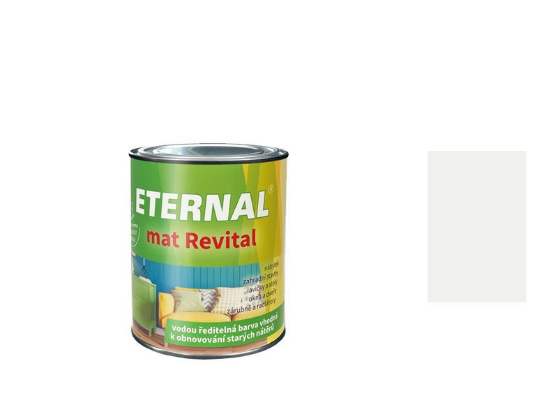 Oblast použití: ETERNAL mat Revital je hedvábně matná univerzální vodou ředitelná akrylátová barva pro vnitřní i venkovní použití určená k nátěrům dřeva, kovových podkladů opatřených antikorozním nátěrem, dřevovláknových a dřevotřískových desek, sádrokartonu, nepochozího betonu a třískocementových desek. Vzhledem k velmi dobré přilnavosti na starých syntetických a olejových nátěrech je velmi vhodný pro obnovovací nátěry.Vyznačuje se velmi dobrou kryvostí, dobrým rozlivem, rychlým zasycháním.